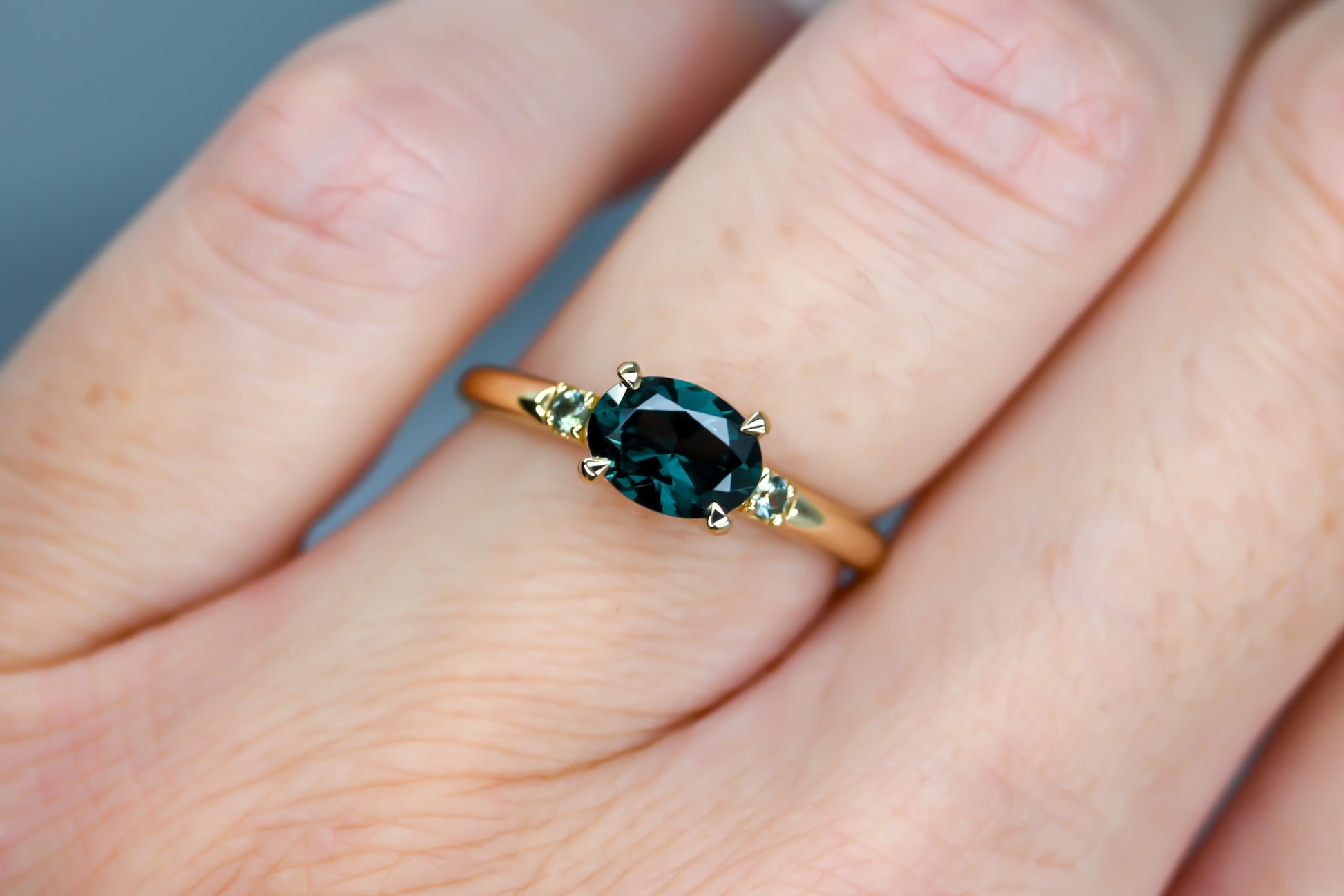 Bague en or jaune 14k sertie d'une belle spinelle sarcelle ovale et de 2 petits saphirs bleu pâle.