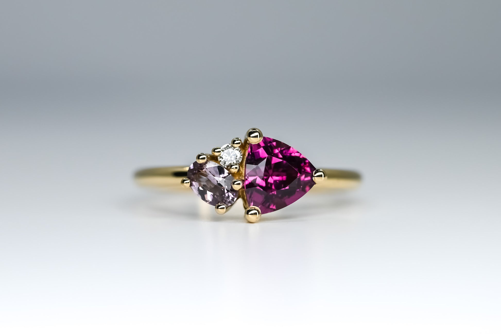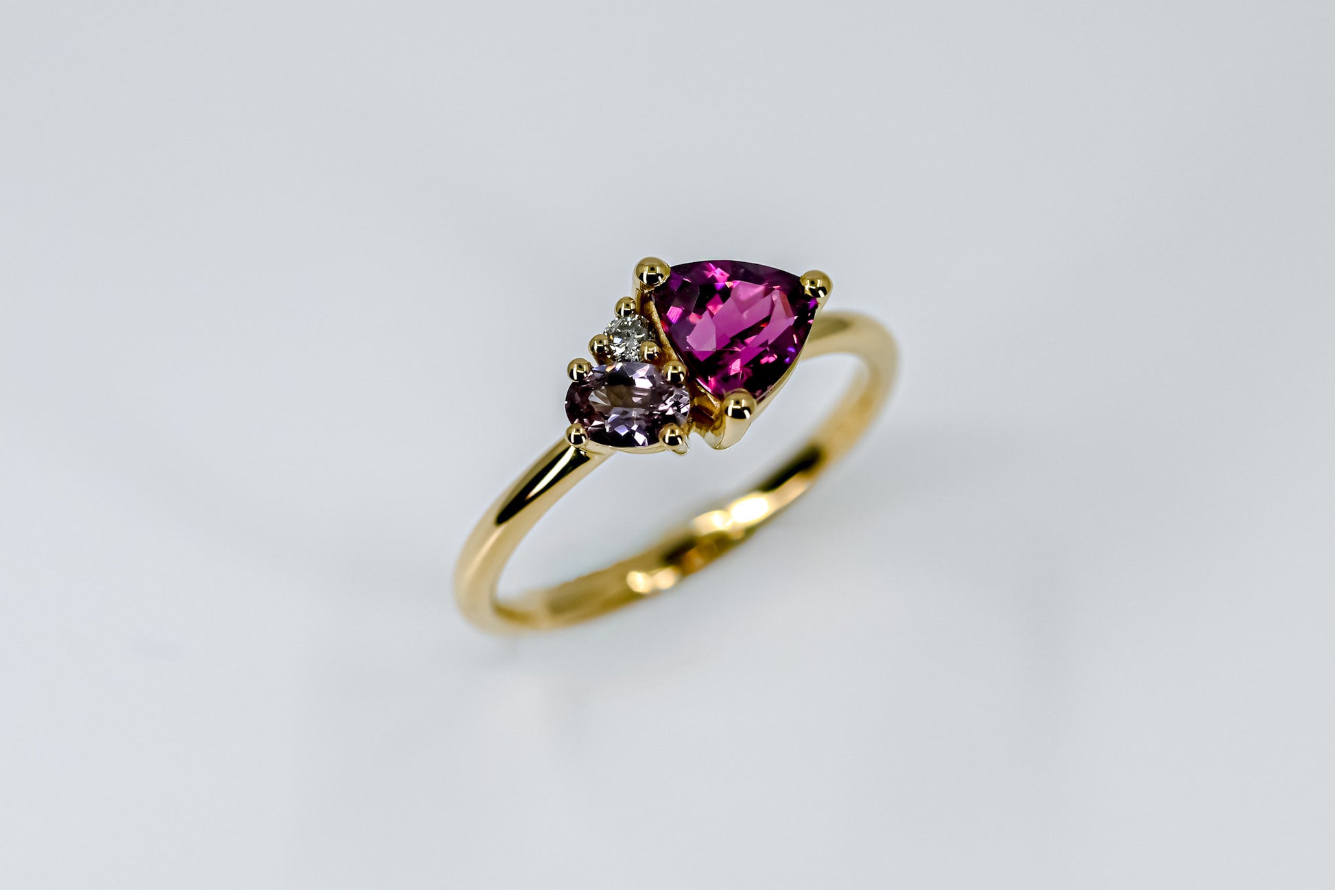 Bague en or jaune 14k sertie d'une rhodolite trillion, d'une spinelle ovale et d'un petit diamant.