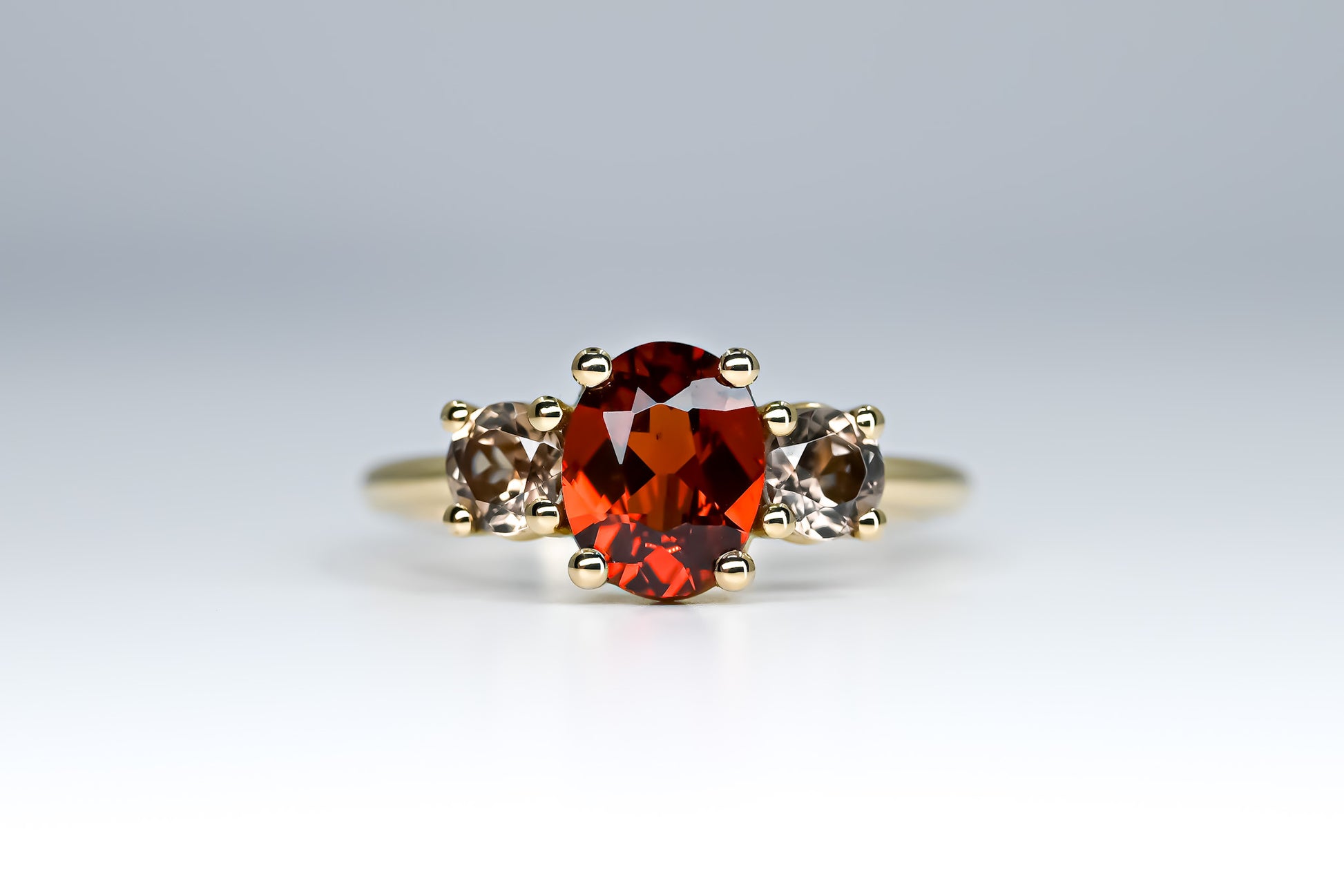 Bague en or jaune 14k sertie d'un grenat spessartite ovale et de 2 petits grenats ronds.