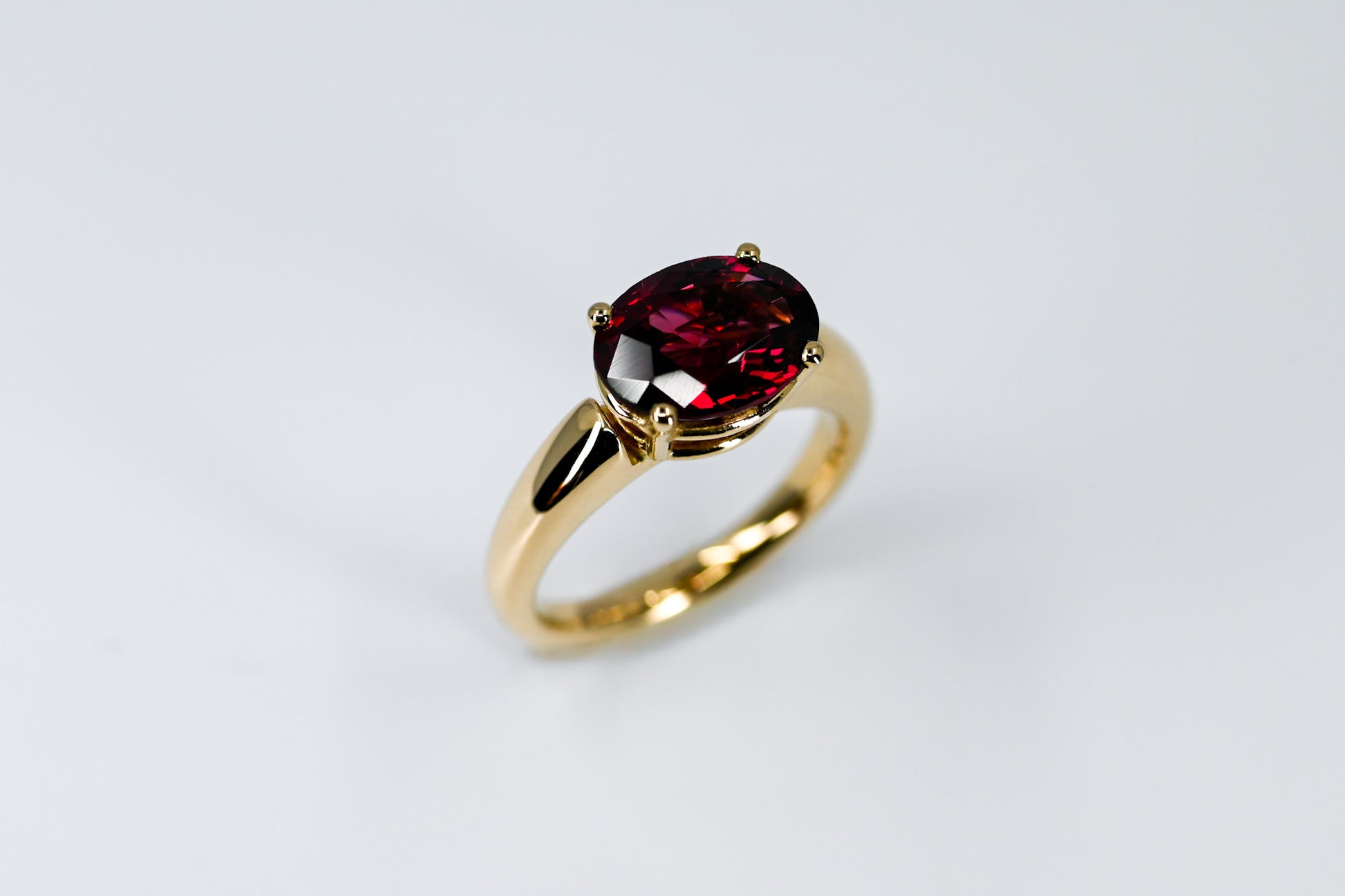 Bague en or jaune 14k et grenat ovale rouge. Le corps de bague dôme est tout arrondi et plein ce qui le rend très doux et confortable.