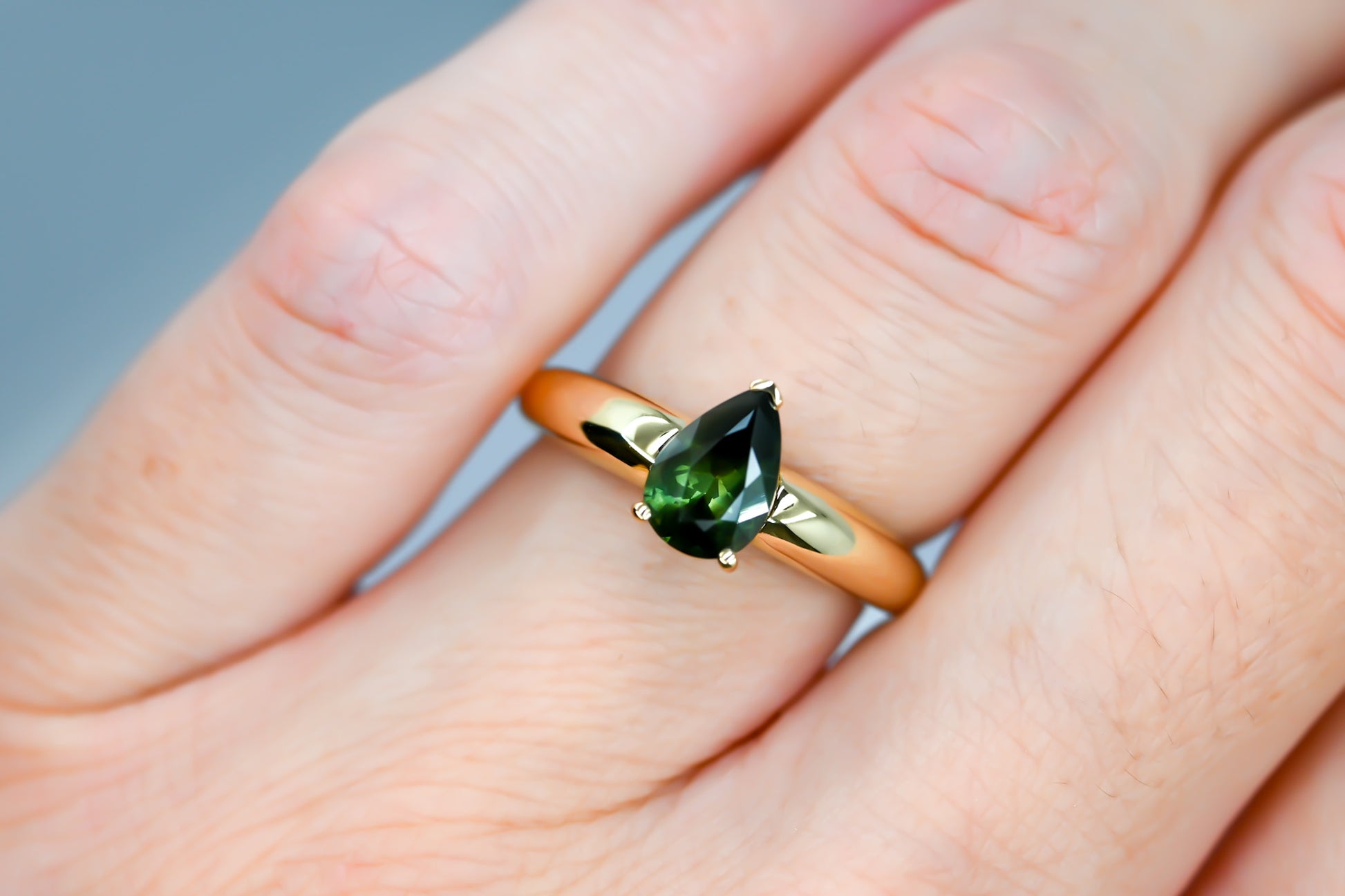 Bague en or jaune 14k et saphir poire vert forêt. Le corps de bague dôme est tout arrondi et plein ce qui le rend très doux et confortable.