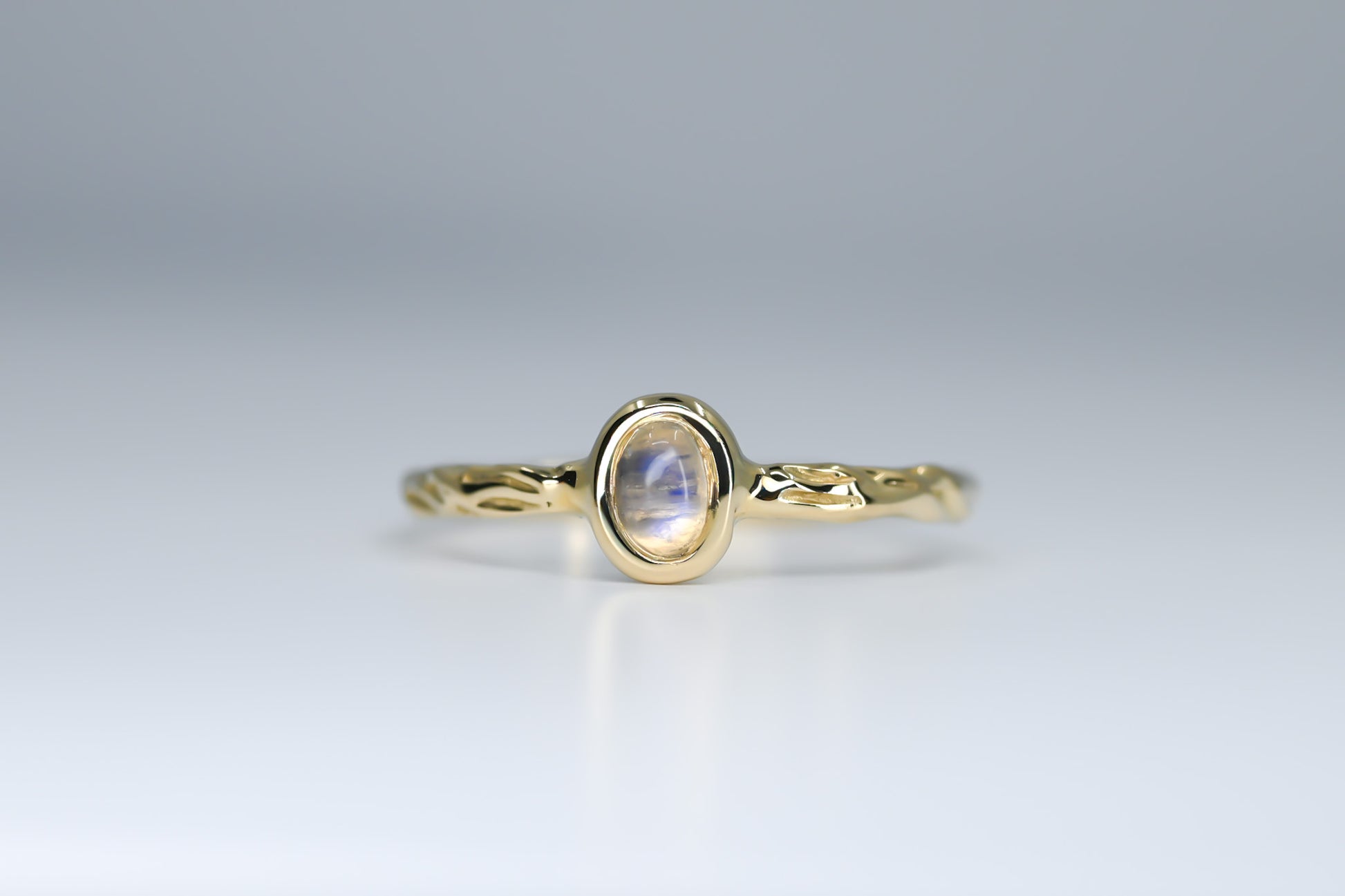 Bague en or jaune 10k serti d'une pierre de lune arc-en-ciel ovale. Le jonc a un profil mince et une texture organique qui rappelle celle d'une branche, ce qui lui donne un look un peu féérique.