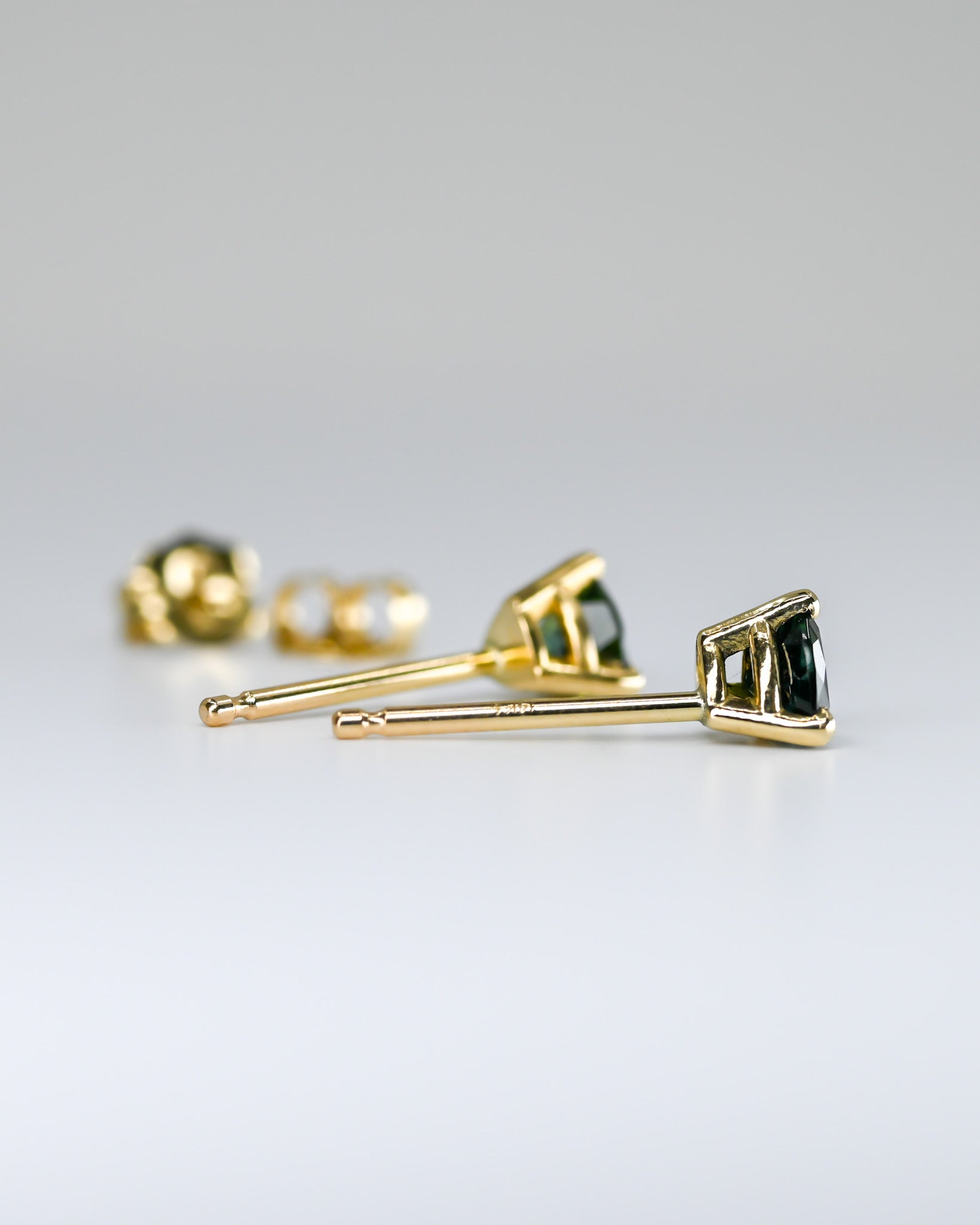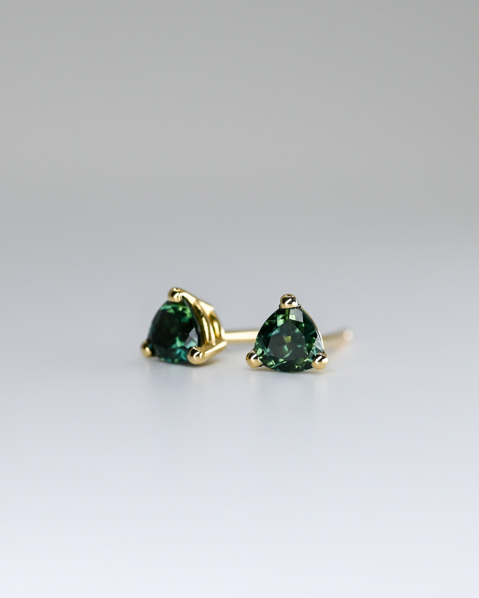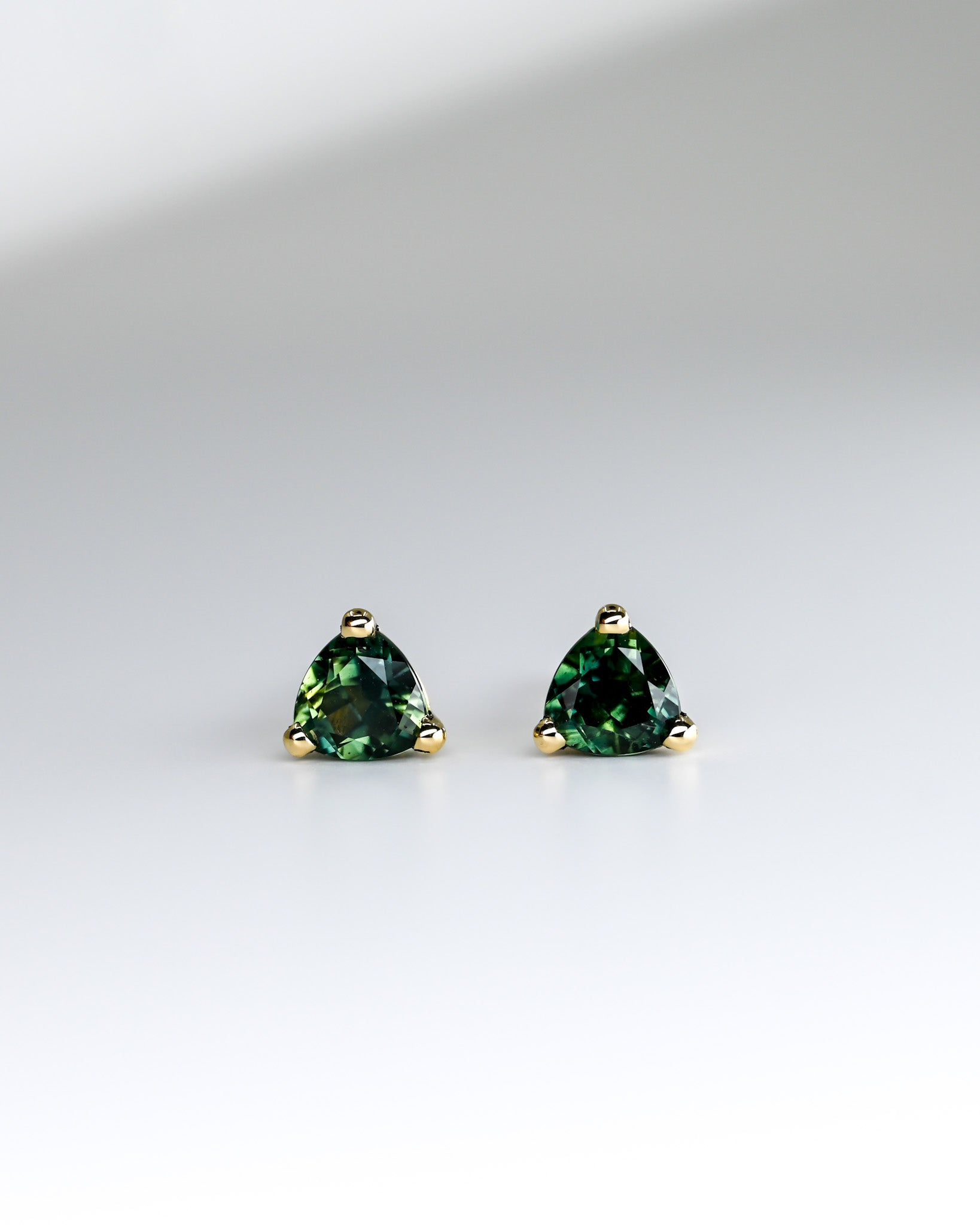 Superbes boucles d'oreilles de saphirs Australiens verts forêts, de forme trillion, dans un serti en or 14k.